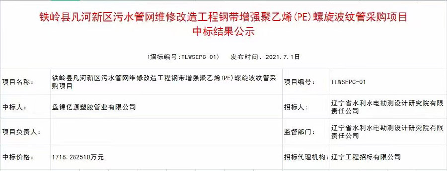 一份耕耘一份收獲,億源管業[爆竹][爆竹][爆竹]成功中標國家環保督察項目鐵嶺凡河污水管網改造,鋼帶增強聚乙烯螺旋波紋1718.282510萬元。億源管業,追求卓越品質,致力于打造市政管道優質品牌。